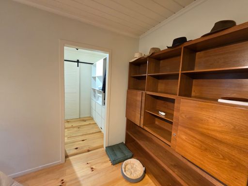 Depósito grande, bem iluminado no porão, lavanderia com armários sob medida.