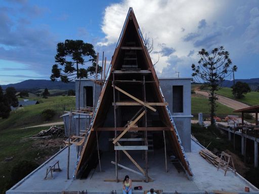 - Estrutura da cobertura da casa em madeira Angelin e pinus autoclave.